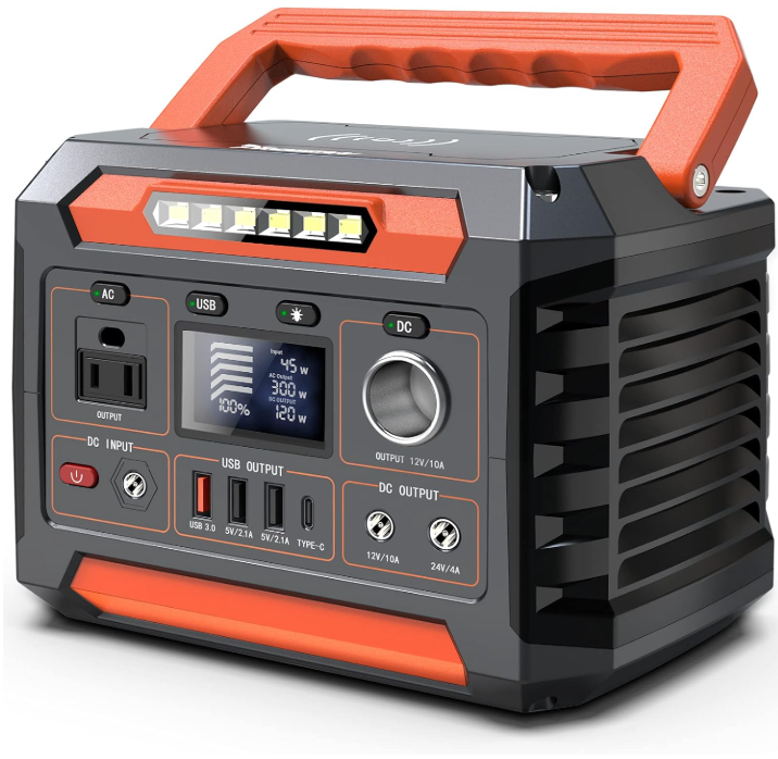 • Multiple Outputs For Choice: This solar powered generator features 1*pure sine wave 110v AC outlet (300w rated, 600w peak); 1*car port (12V/10A, 120w max); Built-in QC 3.0 USB and USB-C output(9V/2A, 18w max) can charge your small digital devices effectively; Fast charger on the top is convenient to charge your phone any where when you forget to bring usb cable (*All ports support pass-through charging*)